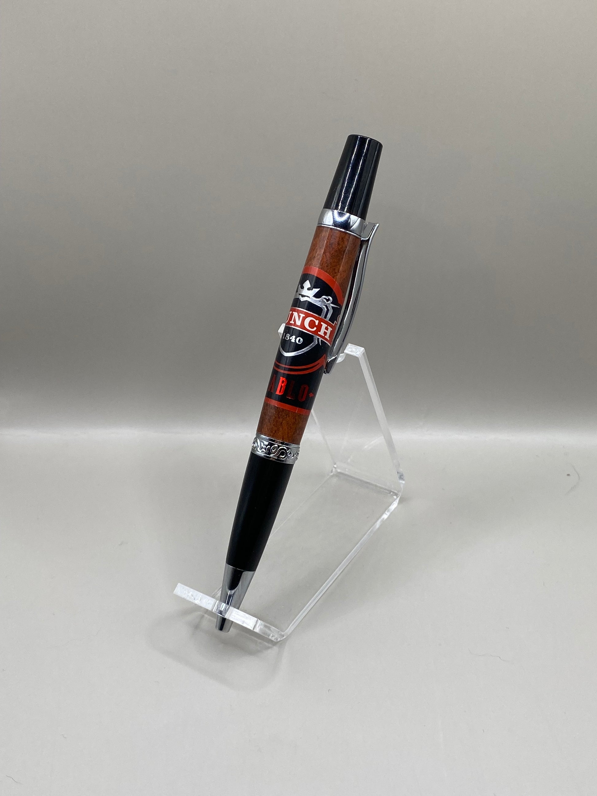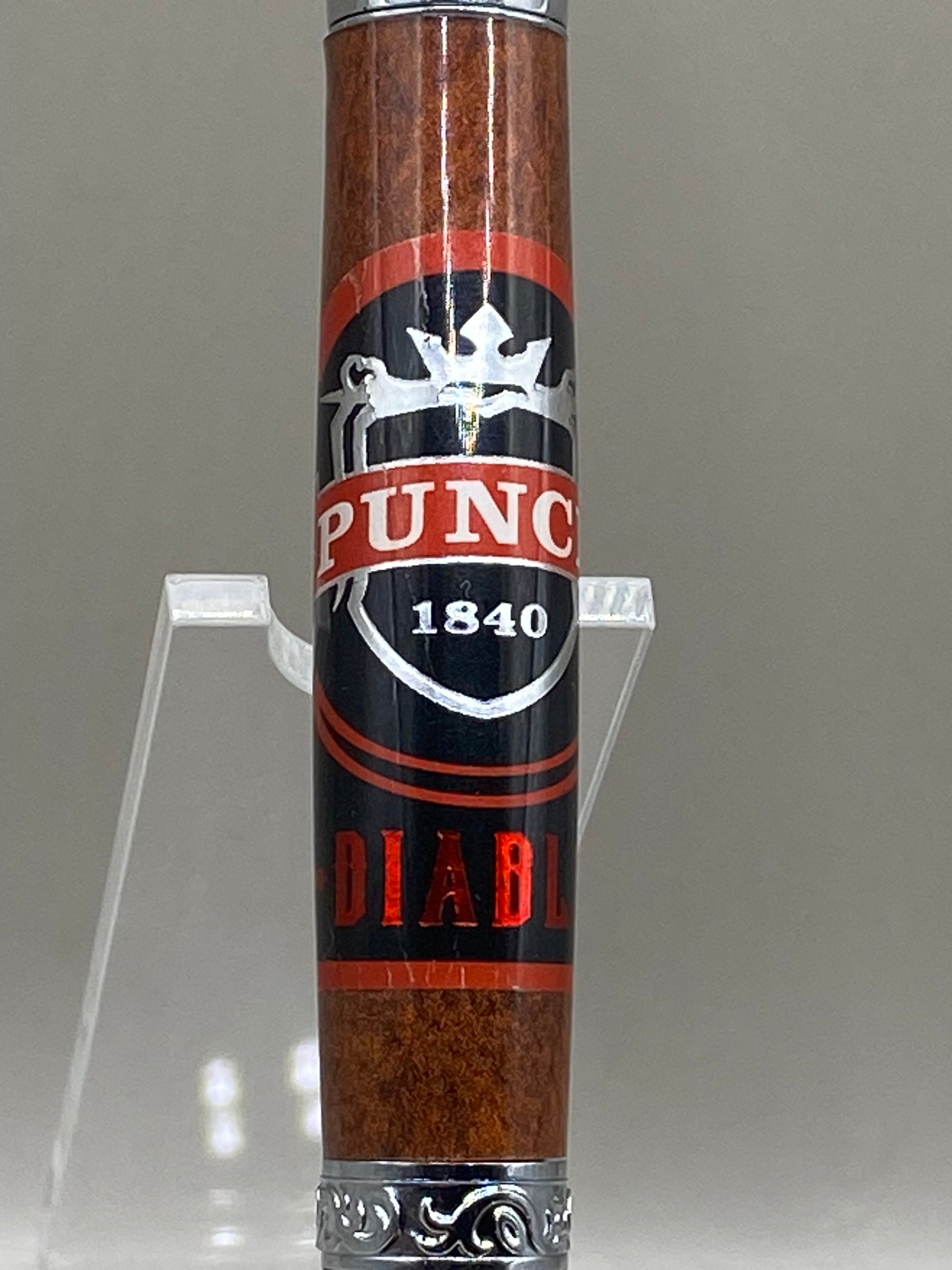 Unleash the dark side of luxury writing with this handcrafted Punch Diablo cigar pen, a bold tribute to one of the most intense and flavorful cigars from the iconic Punch brand. Featuring a genuine Punch Diablo cigar band—complete with its striking black design, silver shield, red ribbon, and devilish “DIABLO” lettering—meticulously cast in crystal-clear resin for permanent preservation and a glossy, depth-enhanced look.